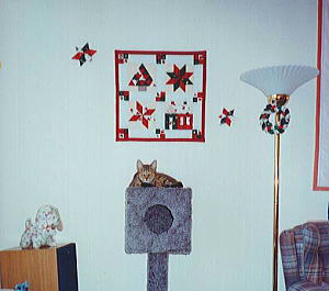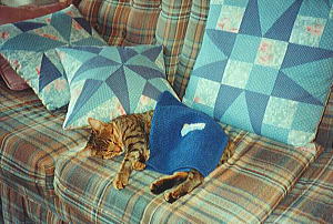 私の作ったパッチワークの前で。 お気に入りの猫ハウスで〜す。 (サンディエゴにて・1993年秋) |
