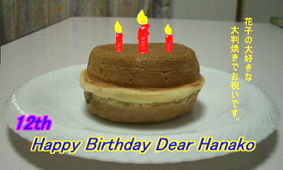 私が大判焼きを買うのを忘れちゃって、 一日 遅れの今日になっちゃいました(x_x) 花ちゃんごめんね・・・ 一応、真ん中の大きいローソクが10歳分で、 小さいローソク2本と合わせて12歳! |