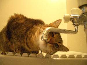 お風呂の蛇口の水が大好きの花子(^^ゞ 飲みにくそうだけれどねぇ〜〜 なにやら丹下左善風(^_^;) |