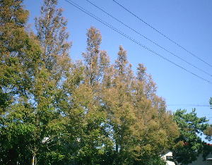 分かるでしょうか? 写真の木々の枝先が茶色に変色しているのが・・・