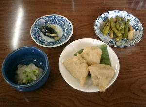 上二つはお通し(小ナスの浅漬けとインゲンと竹輪の煮物)で