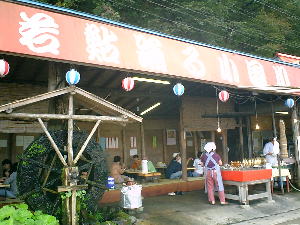 酒田から車で80分位の舟形町の小国川沿いにある 「鮎場あたご」というお店に行ってきた。 ご覧の通りとっても開放的な店構え。 秋雨の時期は大丈夫なのかしら・・・って、要らぬ 心配をしちゃう私(^_^;) 隣りには雨を避けられる座敷もありますけれどね・・・ |