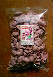 まずは母へのお土産(^^)/ 「むらさきいも せんべい」ってシールに書いてあります。 これが以外と美味しくてビックリ(^o^) むらさきいも風味がいっぱいです♪ |
