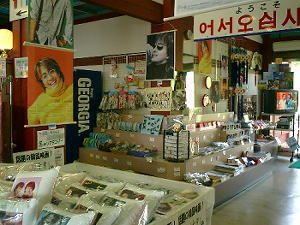 ご覧のようにヨン様がいっぱい(^^) キーホルダー、ストラップ、クッション、壁掛、 時計、ウチワ、マグカップ、ポストカードetc。。。 ヨン様の他に、イ・ビョンホン、パク・ヨンハ、 ウォンビン等のストラップやキーホルダーもありました。 |