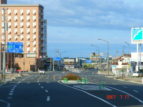 | 6時過ぎという早い時間の為、車もあまり通りません。 道の真ん中にて見慣れた風景を撮ってみました(^^ゞ |
