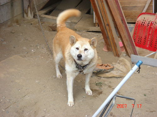 | 近所のワンちゃん。 散歩に連れて行ってもらっているのかず〜っと不安だったけれど、 朝の時点でいなかったので、いつも早朝に散歩に行ってる事が判明(^^) 私が酒田にいる時からいたので、もう10歳はゆうに超えているはず・・・ でも今回も元気な姿を見れたので、本当に良かった♪ この写真だけ9時過ぎに撮影。 |