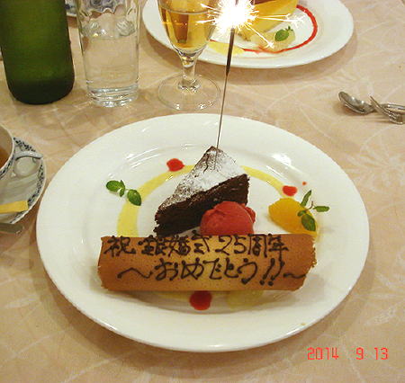 コース料理を食べて最後のデザートで記念プレートを作ってもらいました。
