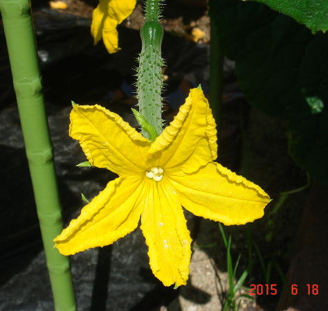 これは庭で栽培しているキュウリの花。。。 植えつけて1ヶ月で収穫が始まりました。