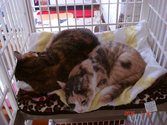 3段ケージの3段目、梅子の寝床に桃子がお邪魔して一緒にお昼ね(u_u)...zzzZ
