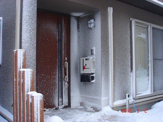 まずは南向きの玄関や壁、スプレーで吹きかけたように雪で真っ白です。