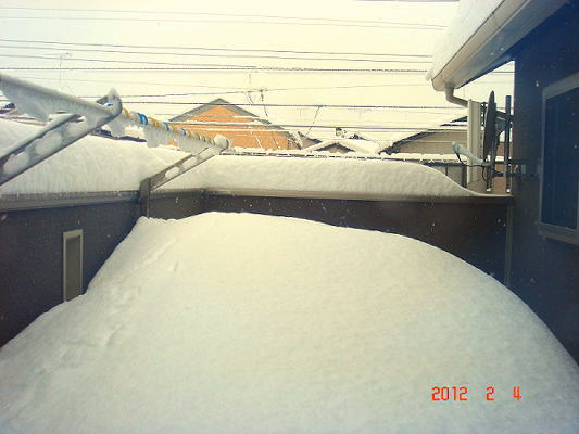 我が家のベランダ。 降り積もった雪と屋根から落ちてきた雪で、こうなってます(^^;
