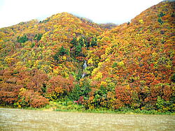 ← 途中の最上川の白糸の滝付近の 紅葉風景。 実際に見ると、鮮やかなオレンジと 黄色が目に眩しいくらい・・・ |