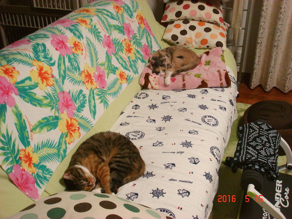 暖かくなってきて、 離れて眠るようになりました(^^ゞ (2016年5月) |